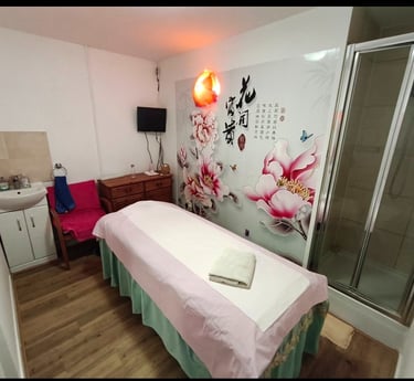 Step into a serene oasis where calm and comfort embrace you. The massage room is softly lit with warm, ambient lighting and the gentle glow of candles, creating an atmosphere of deep relaxation. The subtle scent of essential oils lingers in the air, while tranquil music plays quietly in the background. A plush, heated massage table sits at the center, dressed in crisp, clean linens and fluffy towels. Natural elements like bamboo accents, potted greenery, and stone features enhance the peaceful, spa-like feel. Every detail—from the temperature to the texture of the sheets—is carefully curated to provide a soothing, restorative experience.